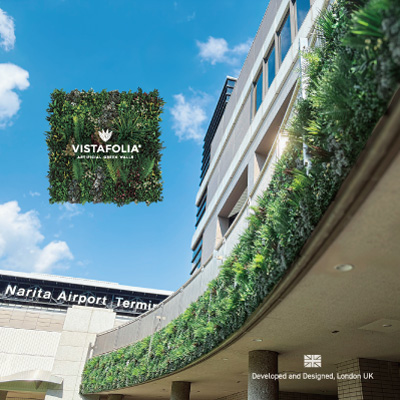 ビスタフォリアはポリエチレン製の人工植物が約80cm×80cmの鉄製メッシュにデザインされたオリジナルの壁面用緑化パネルです。